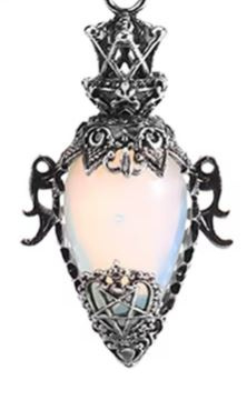 Wicca pendel met Opaliet druppel en een metalen omhulsel met pentagrammen en kroontje aan een ketting.