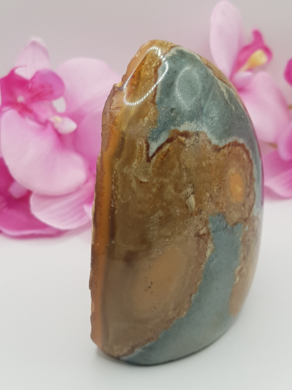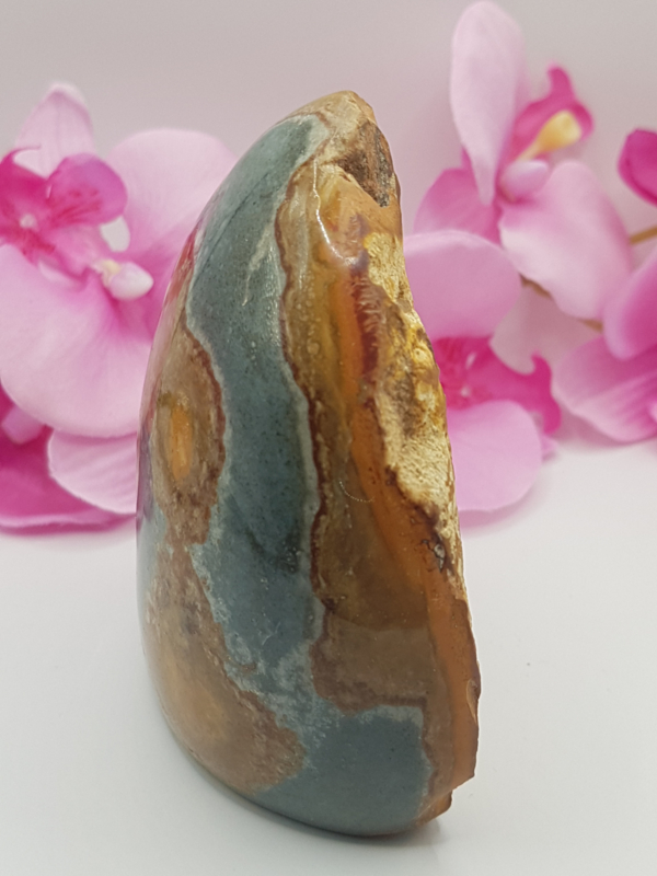 Polychroom Jaspis kan helpen om te aarden, kan helpen bij het beschermen en het verwijderen van negatieve energie, reinigt de chakra’s en de aura. Kan goed helpen bij elektrosmog en tegen straling.