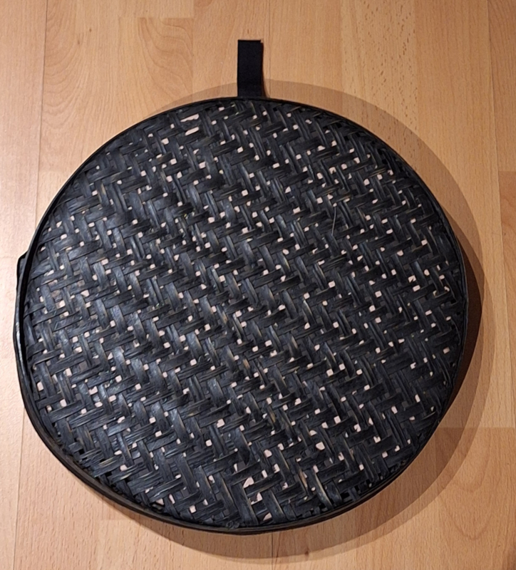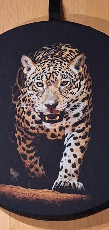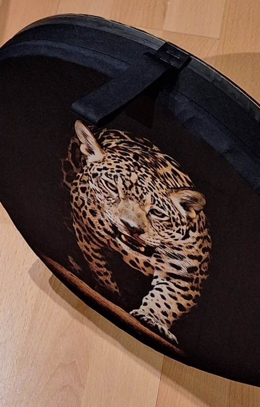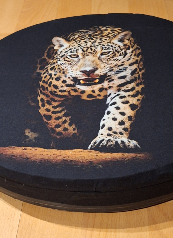 Hand gemaakte oceandrum "Panter" ca. 36 cm doorsnee op een mand met zwarte achterkant en hoge rand.